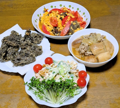 麻婆豆腐とニラ卵の晩ご飯と クジャクアスターの花♪