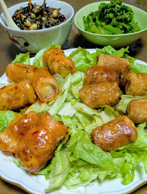 こんばんは?今日もお疲れ様でした(◍•ᴗ•◍)?今回も見に来て頂きありがとうございます_(_^_)_今日も早速ですが、晩ご飯てす。絹揚げの豚肉巻き味···
