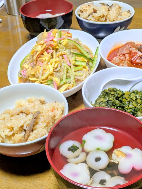 鰻丼とにゅう麺の晩ご飯と 干しキュウリの甘酢漬け♪