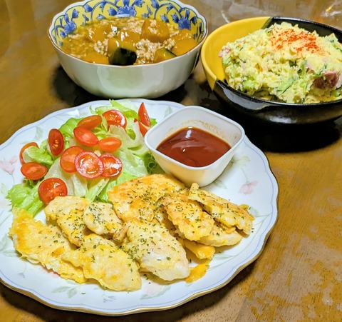 鯖の竜田揚げと鶏肝煮の晩ご飯と バタフライピーで青いハーブティー♪